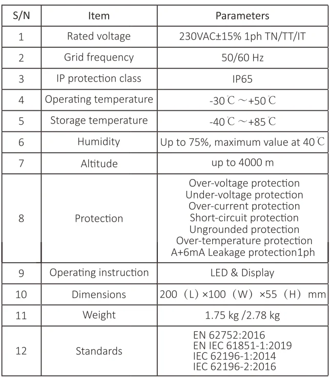 | Protection Function | Over-voltage protection, Under-voltage protection, Over-current protection ,Short-circuit protection, non-grounded protection, Over-temperature protection, DC 6mA Leakage protection 1ph |